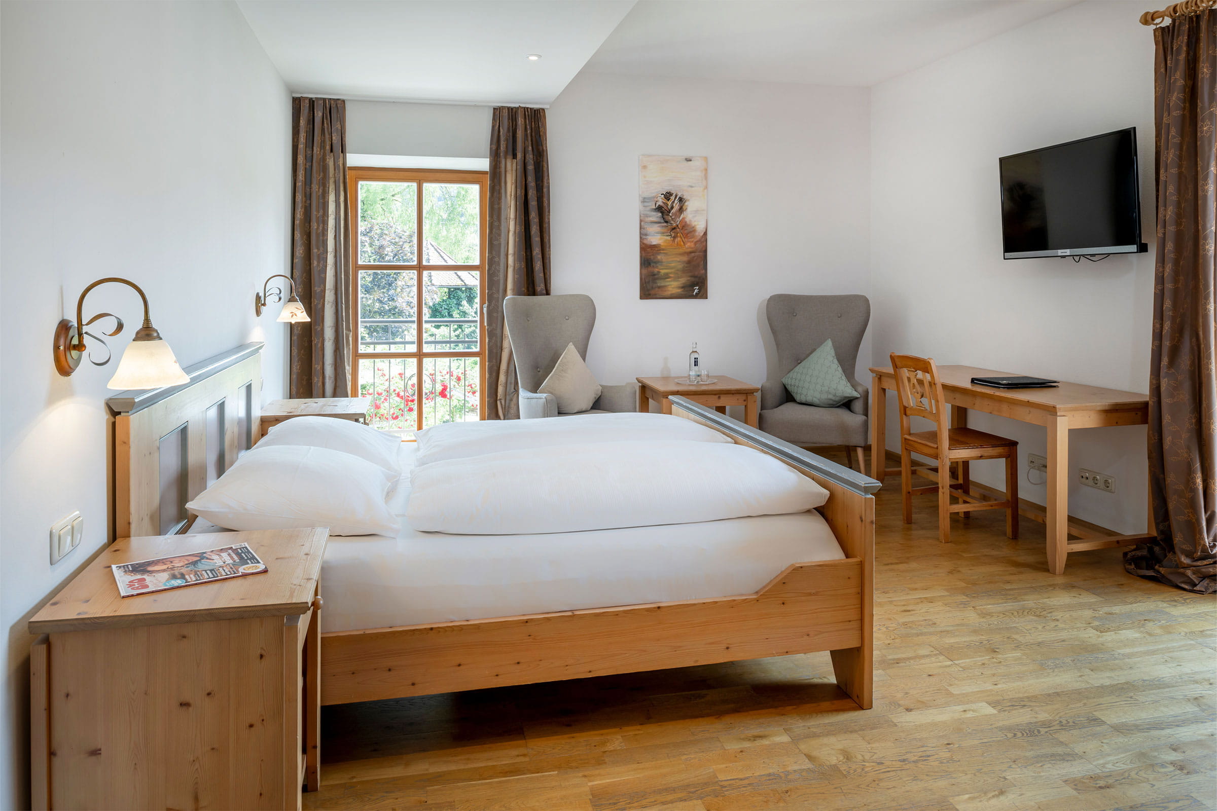Unsere Sonnenwaldzimmer mit oder ohne Balkon sind als einzige Kategorie für Ihre Übernachtung mit Hund im Kammbräu buchbar.